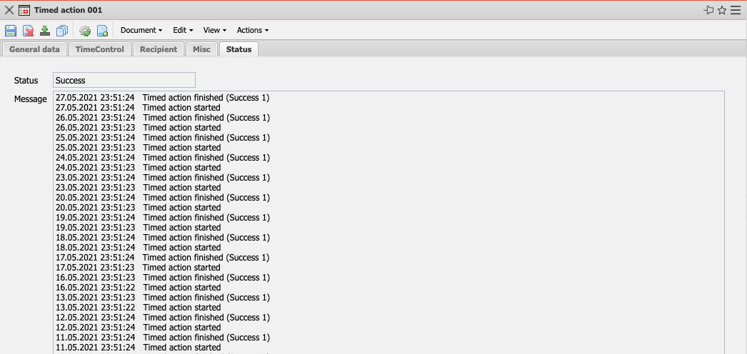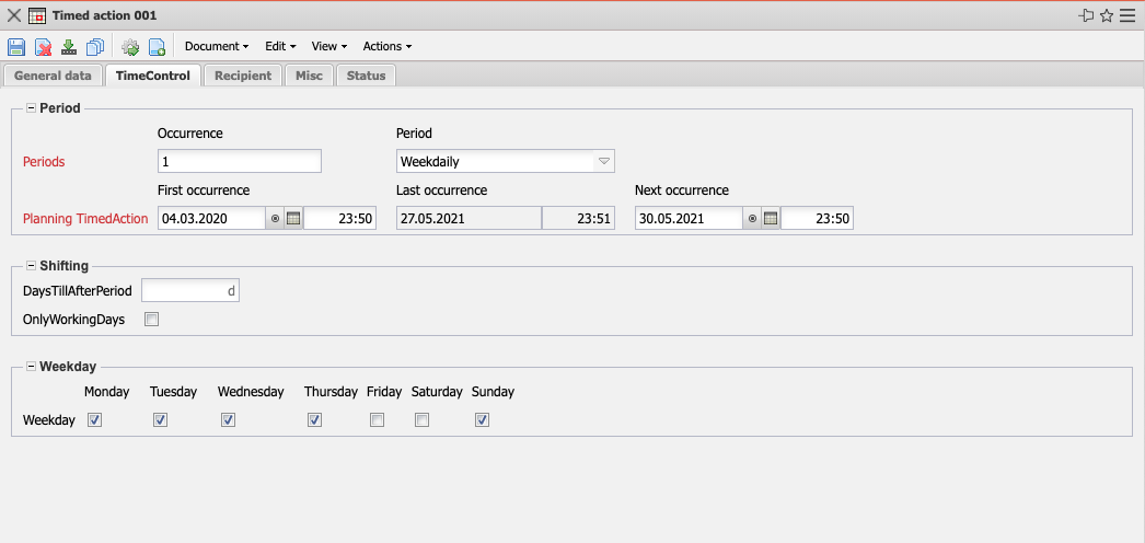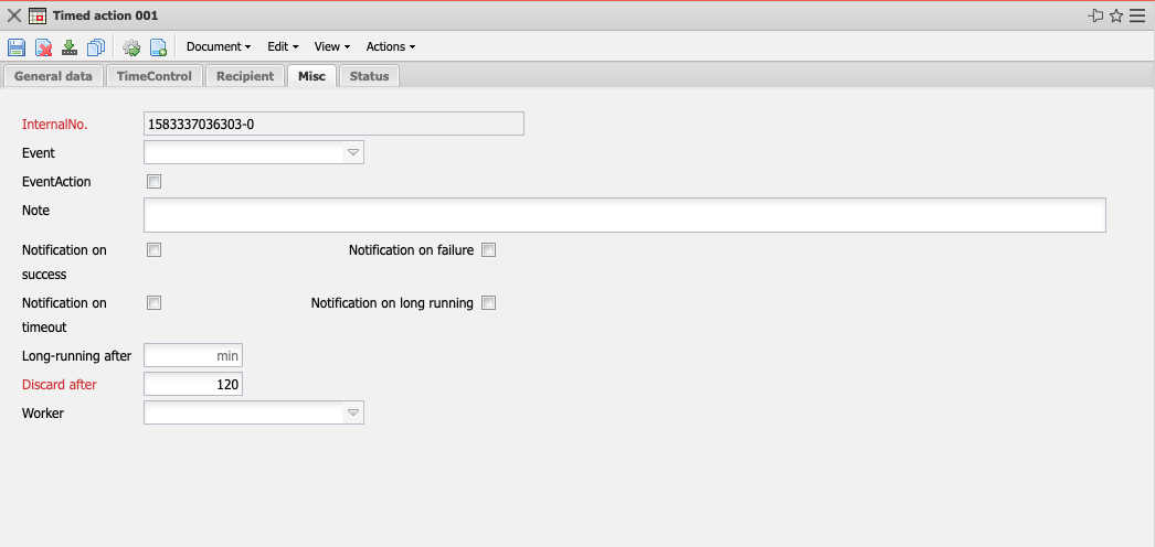 - Discard After: If the system is overloaded with the processing of all timed actions, you can set in this field how many minutes after the appointment a timed action is still valid. If the timed action becomes invalid after this period, it is postponed to the next appointment.