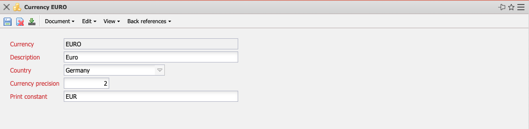 The mask currencies manages the currencies for the entire system. The currency is assigned to a country and contains information about the number of decimal places and the print constants of the currency. The currencies are required for cost entry and the components of the Billing Module.