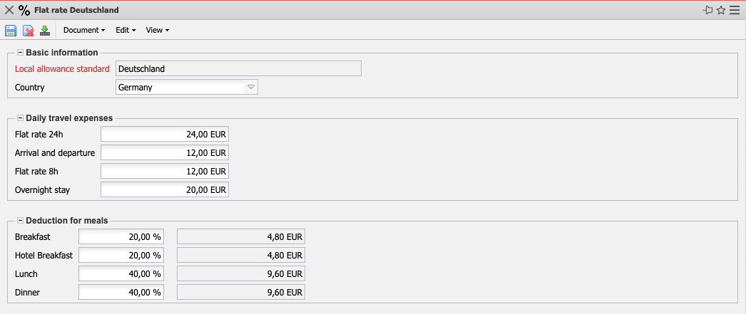 The flat rate mask manages the statutory per diem and accommodation flat rates for each country. The internal per diems are required to determine the daily allowance and accommodations rates to be paid to the employees, within the travel expense calculation, and can be invoiced to customers (if agreed upon accordingly).