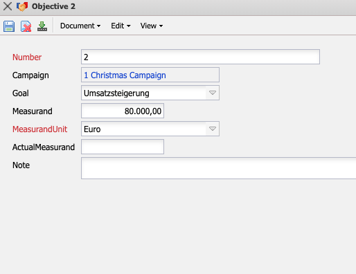 The Campaign Goal mask manages the goals of marketing and sales campaigns in the system. Among other things, the objective, the measured variable and unit as well as the actual values are stored here.