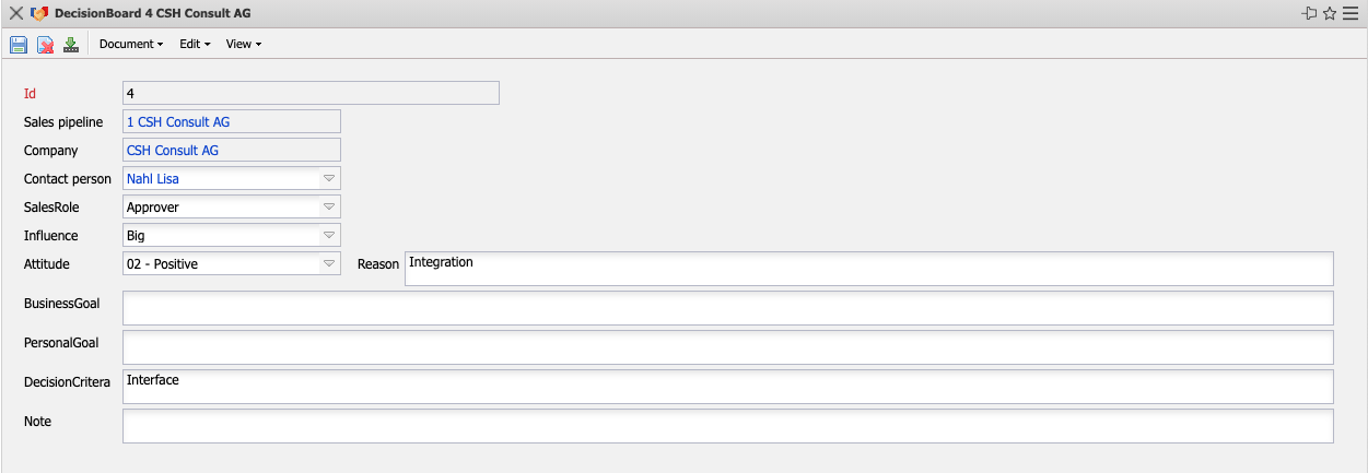 The mask Decision Board manages the persons involved in the sales pipeline (contact persons) in the system. The role, influence, attitude and other settings can be entered here.
