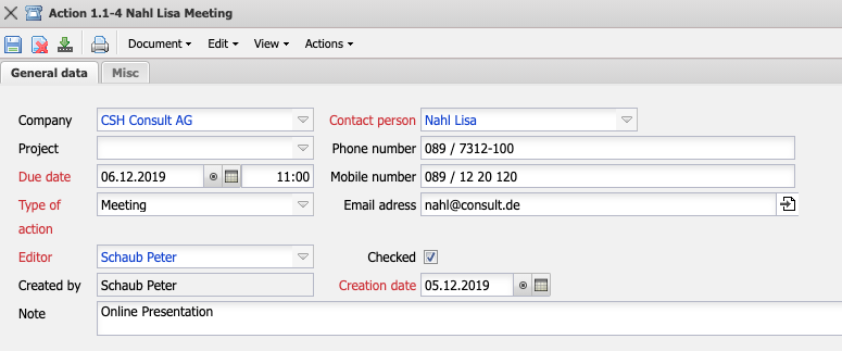 - Checked: This check box allows to mark an action as processed/completed. Uncompleted actions can thus always be displayed in the contact overview if desired.