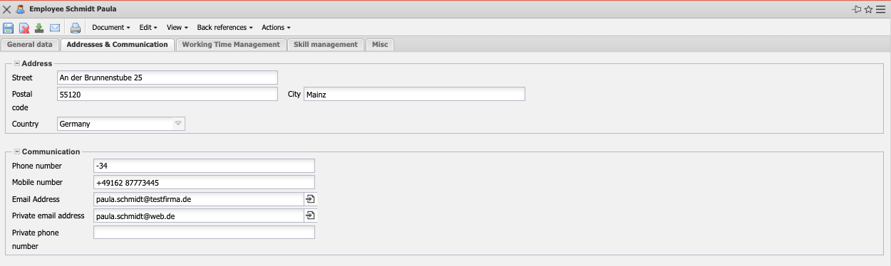 • Phone, Mobile and e-mail Addresses: These fields indicate the employee's availability by telephone (office, private, and mobile) and by e-mail. Clicking on the e-mail address opens the user's standard mail program with the e-mail address entered. The e-mail address is also relevant for the time services function.