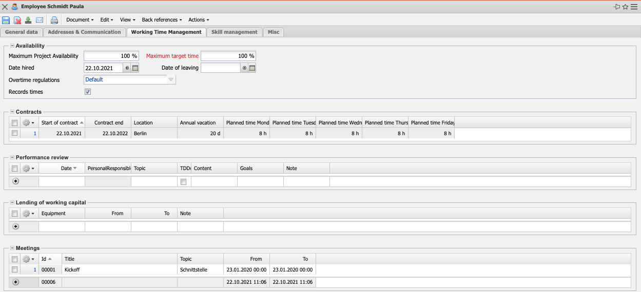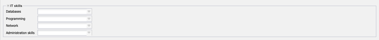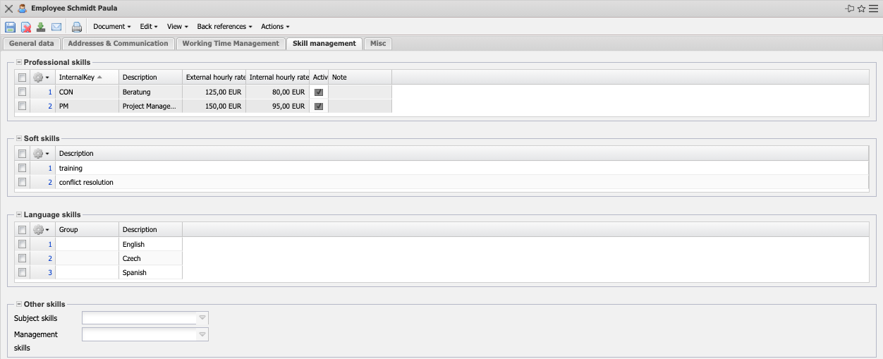 • Professional Skills, Soft Skills, Language Skills, Other Skills, IT Skills: These fields allow the assignment of further skills of the employee.