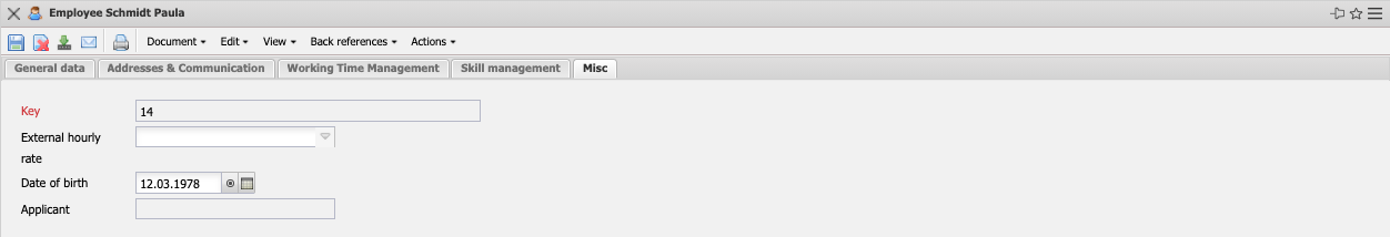 • Salutation, Title, Surname and First Name: These fields indicate the salutation or/and the title and the first and last name of the employee. The characteristics for the form of address can be defined and changed in the collections.