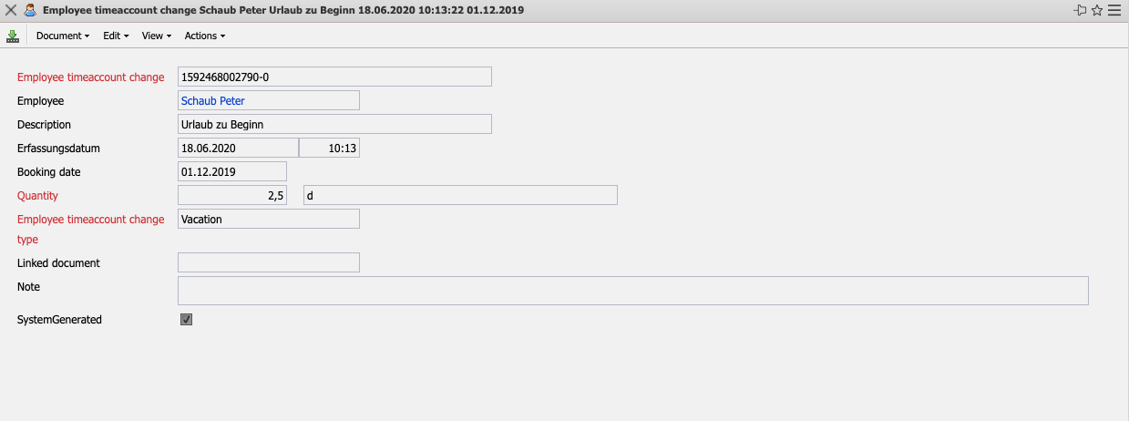 • Employee Timeaccount Change: This field indicates the key field of the posting. The system will automatically provide this with the employee name and a sequential number.