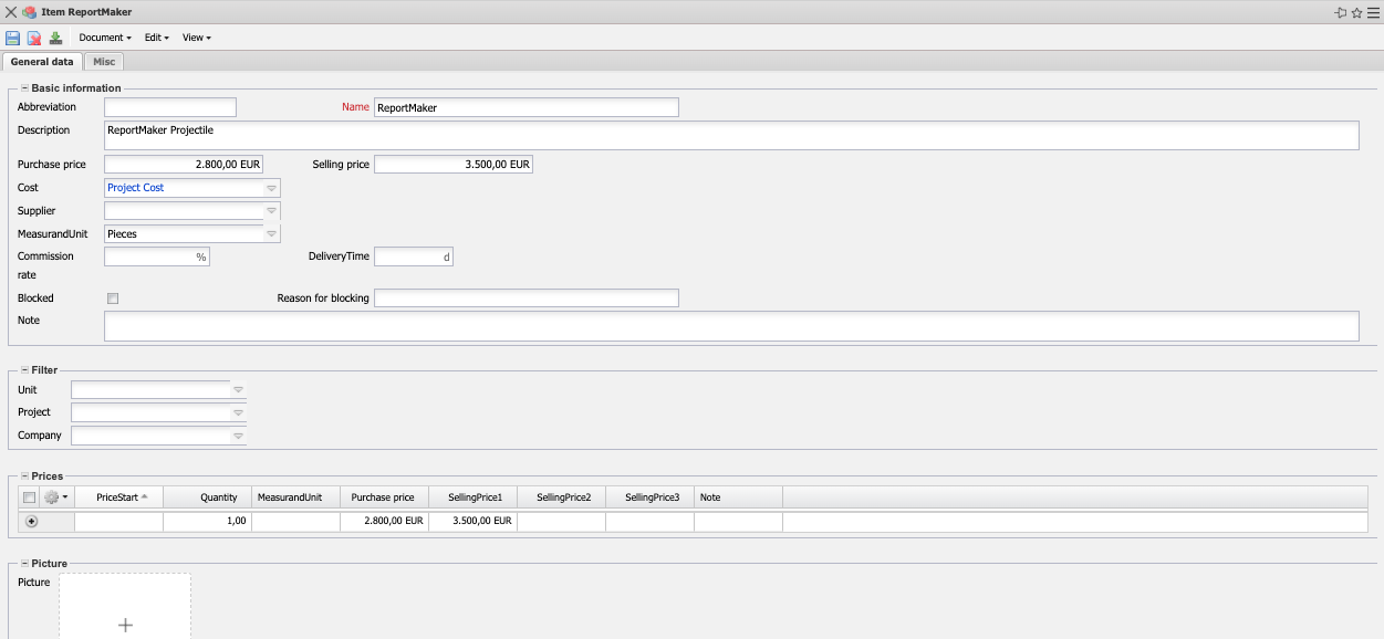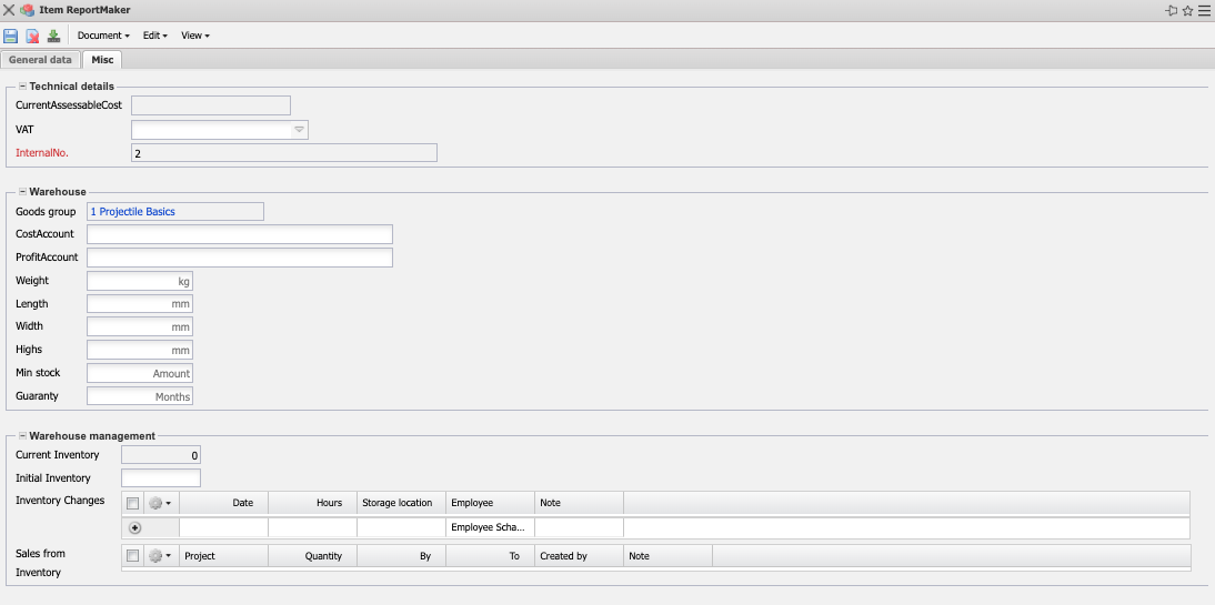 The item mask manages the articles (or external services) in the system, which can be invoiced on a project-related basis. Here you can store articles of the company's own product portfolio or external services with purchase and sales price. These services can be invoiced project-related in the mask external costs when entering them. In addition, this document type also provides information about the stock level of the article and enables the definition of the minimum stock level for the information if this minimum level is not reached.