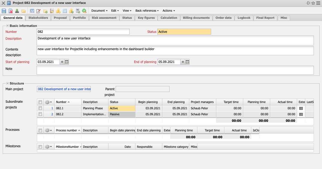 - Subordinate projects: This element contains a list of all assigned subprojects. After defining subprojects, they are automatically transferred to the parent project as subprojects.