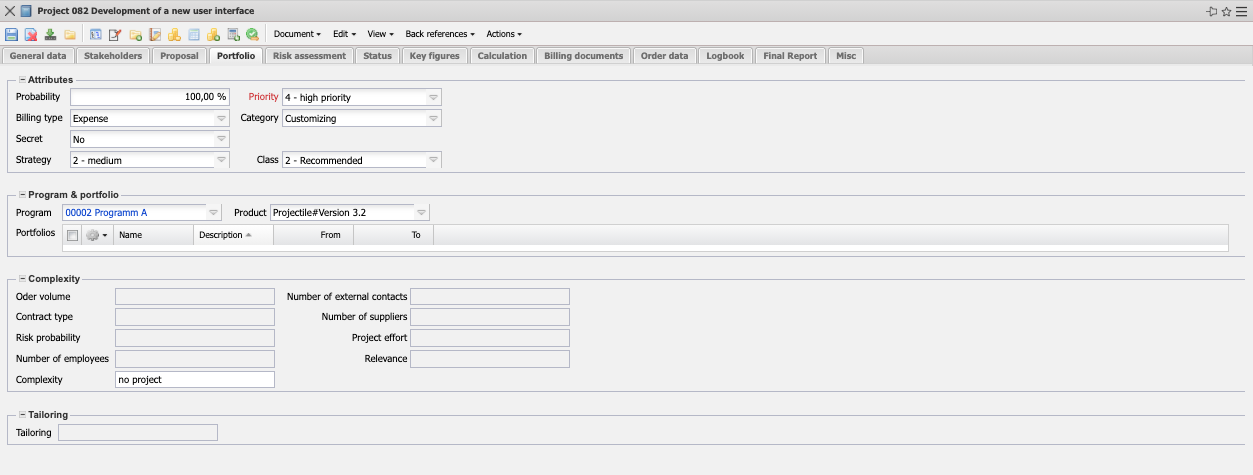 - Program, Portfolio: If the defined project is assigned to a portfolio or program, the corresponding element is automatically displayed here or can be selected here.