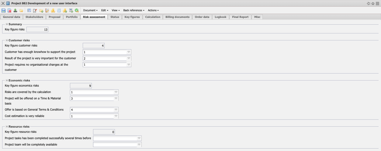 The risk assessment presented is an implementation example and differs from it in many versions. The risks are categorized (here into customer risks, economic risks, resource risks and execution risks) and often include point systems.