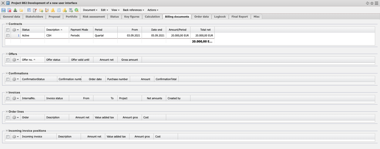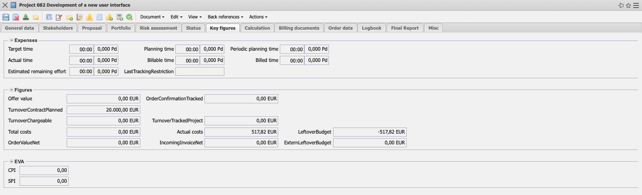 - Estimates: Here the project manager can regularly enter the degrees of completion of the project (for example for controlling or POC valuation).