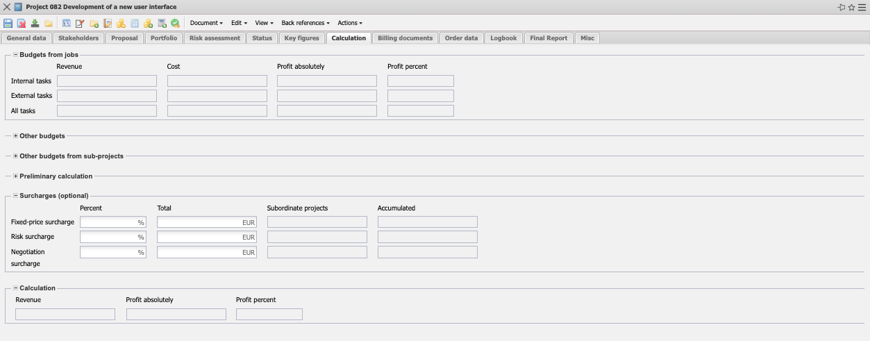 On the “Calculation” tab, the upper frame contains planned sales, planned costs and planned profit (absolute and percentage). These values are calculated on the basis of the work packages. In the next frame other budgets can be managed, e.g. for travel expenses, external consultants and license fees. The lower frame contains the overheads. In most versions, up to three surcharges (absolute or percentage) can be entered. In the standard version, these are surcharges for fixed-price projects, risks (usually in the effort estimation) and negotiation surcharges.