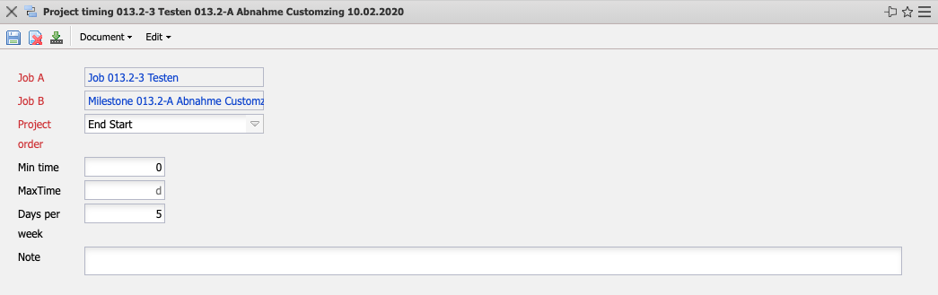 The Project Timing mask (formerly called Jump Sequence) manages the time relationships between two different work packages and/or milestones that belong to the same project. The jump sequences or relationships defined here between the predecessor and successor form the basis for the networked Gantt diagrams (see also document type Project Evaluations in the Evaluation module) and for the extended planning options based on the network technique.