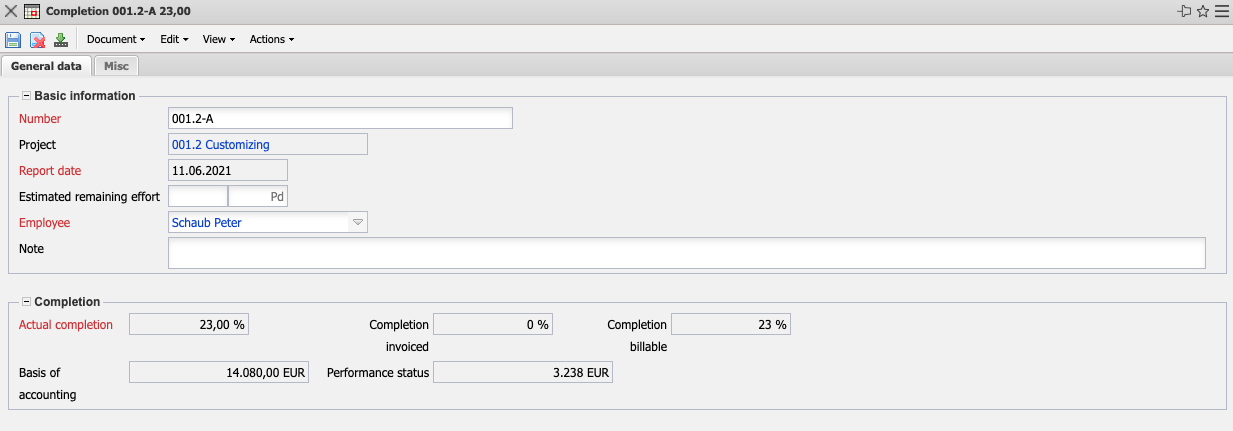 - Project: In this field, you select the project for which you want to provide an estimate of the degree of completion. The projects can be defined and changed in the mask project.