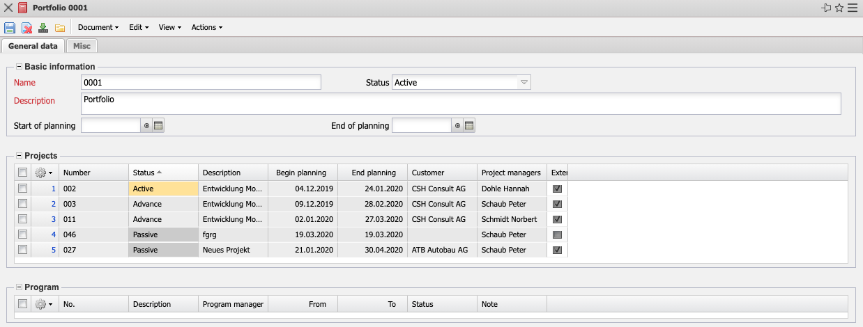 • Start of Planning/End of Planning: The start and end of portfolio management is entered in these fields.