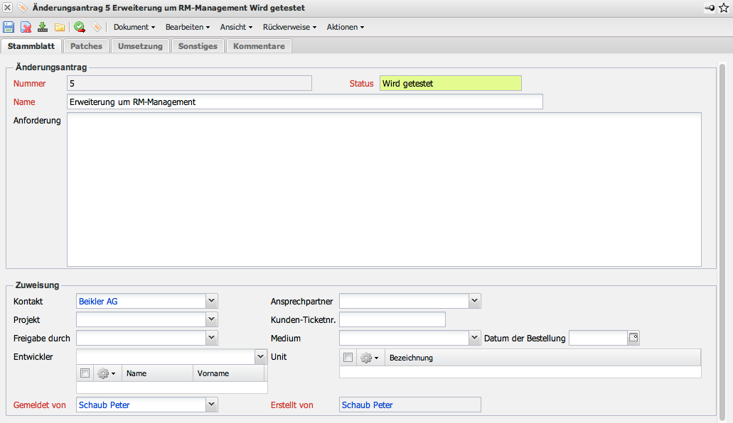 • Anforderungslisten: In dem Feld Anforderungslisten werden alle Anforderungslisten angezeigt, in denen der Änderungsantrag eingetragen ist.