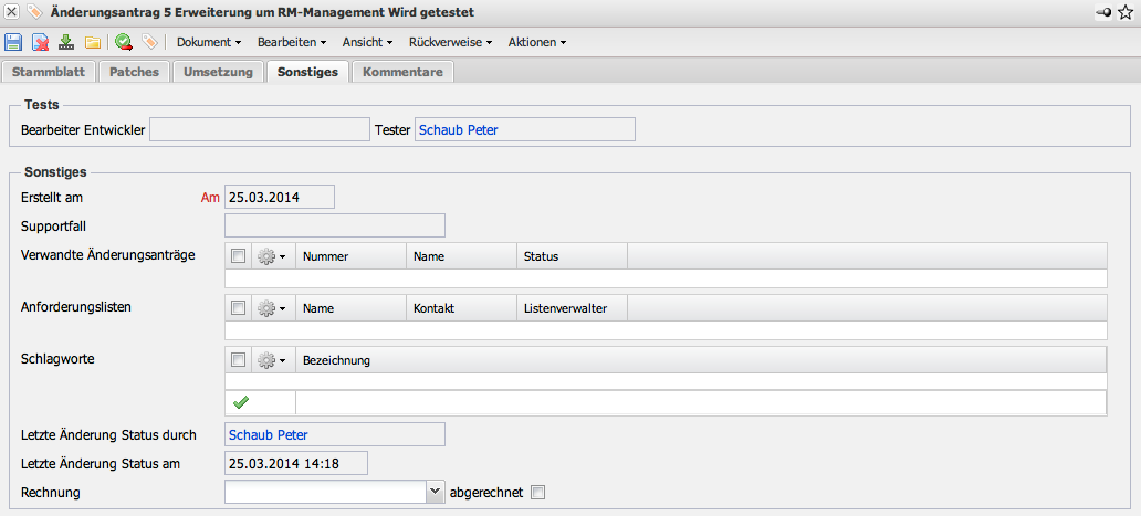 • Status: Dieses Feld wird über die Aktion “Status setzen” je nach Status des Änderungsantrages von den Bearbeitern des Workflows gesetzt.
