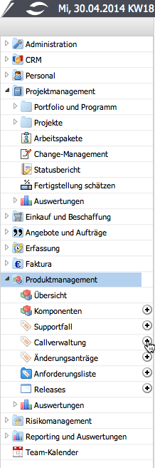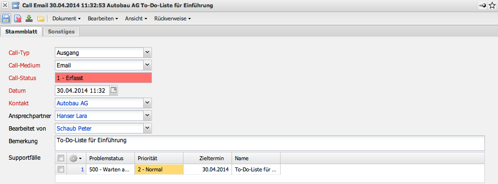 - Supportfälle: Jeder Call kann aus beliebig vielen Supportfällen bestehen. Diese Supportfälle sind auf den Call bezogene Aufgaben mit Priorität, Status, Zieltermin und Zuständigkeiten.
