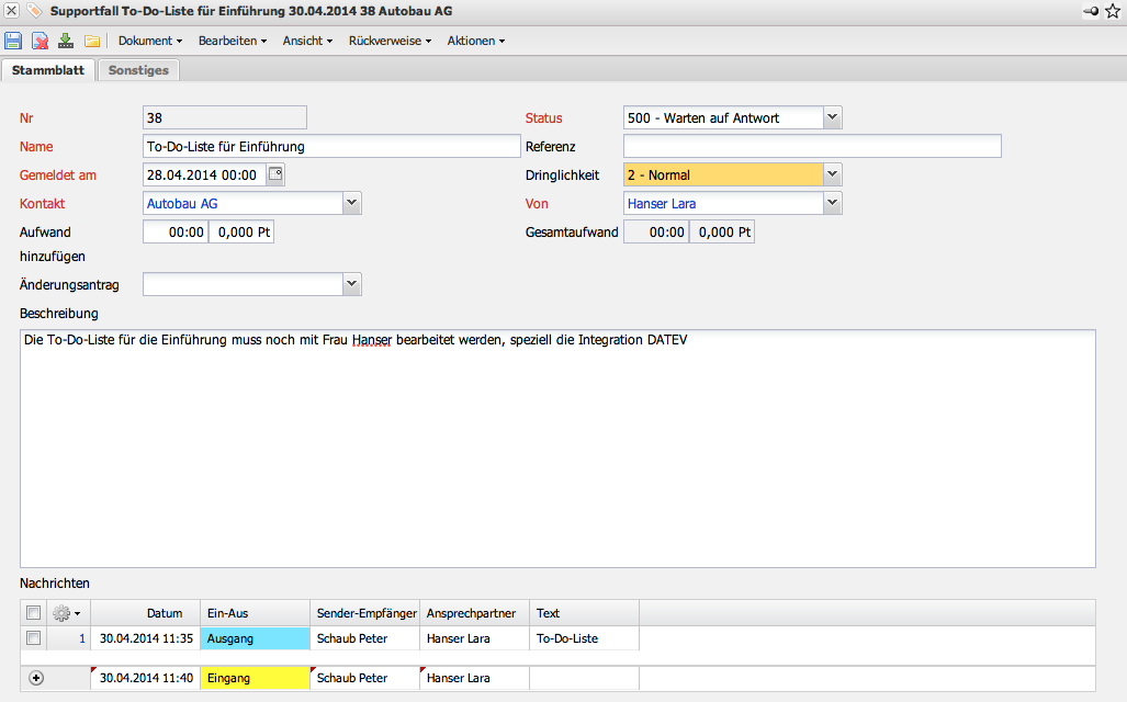 - Nachrichten: Für jeden Supportfall können beliebig viele Nachrichten hinterlegt werden, um den Supportfall detailliert zu dokumentieren.