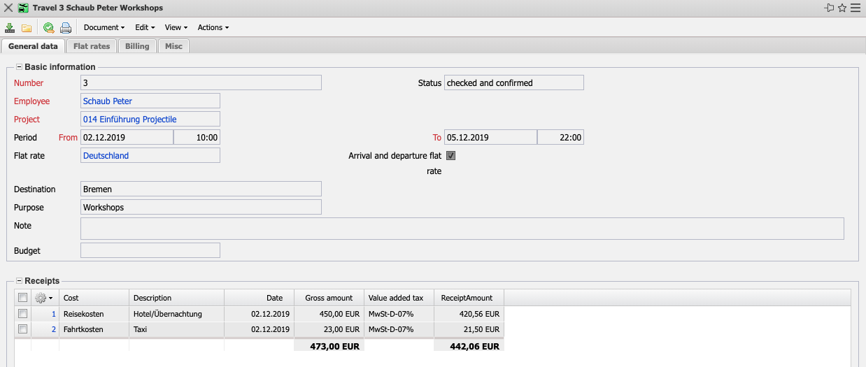 - Receipts: This element contains a list of all assigned receipts for the trip (see also the receipt mask).