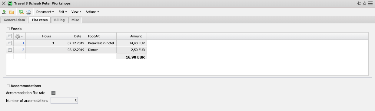 - Foods: This element contains a list of all assigned meals for the trip. These meals are used if the hotel costs or business meals contain meals that are to be deducted as imputed income (see also configuration).