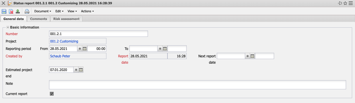 - Report Date: The field Report date marks the date and time of the status report. By default, the current date is provided by the system.