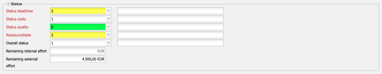 - Quality Status: Here the user enters the quality status of the project. The standard statuses are 0 - Favourable, 1- Scheduled, 2 - Problematic and 3 - Critical. The status can be defined and changed in the Collections (ProjectReportStates).