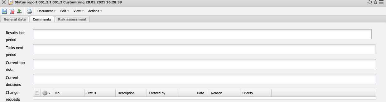 - Comment Critical, Problematic, Scheduled and Favourable: : Comments on the status messages Dates, Costs and Quality (see master data sheet) are stored here if necessary.