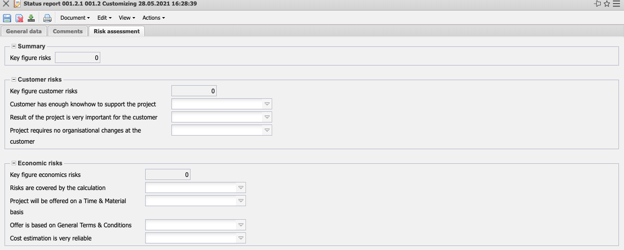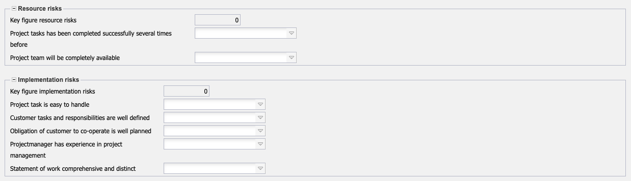 - Critical Factors/Risks: Critical factors or risks for the project process can be entered here. Another possibility to manage risks for the project is the module risk management.