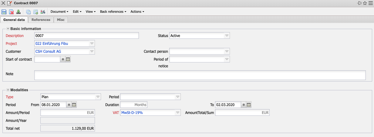 - AmountTotal/Sum: Here the periodic invoice value for the contract can be entered (if Payment Plan = “Periodic” and a period has been entered).