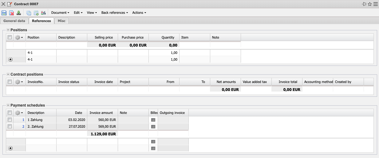 The mask contract manages periodic invoices with their basic conditions. This functionality can be used, for example, for maintenance and service contracts or the billing of domains or subscriptions. The mask contains information about the project, the invoice recipient, the scope of services, the terms of payment and the generated invoices.