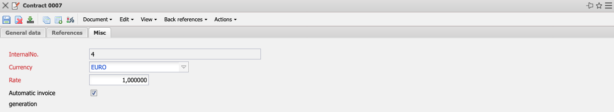 - InternalNo.: This numeric field assigns a unique identification number to the contract, which is automatically assigned by the system.