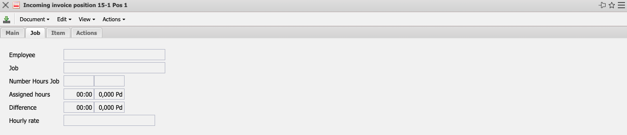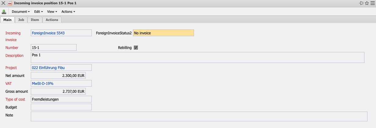 The mask incoming invoice position manages the items of the incoming invoices. It contains information about the project, the net and gross amount of the line item, sales tax, cost element, and whether the line item has already been invoiced.