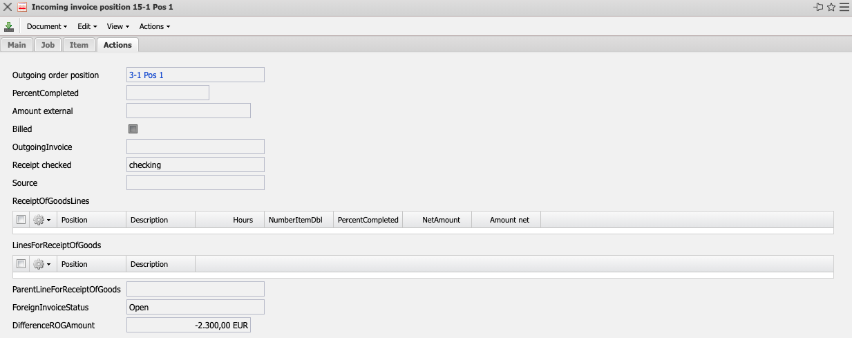 - ReceiptsOfGoodLines: If you use the promotion -Generate Invoice - via a purchase order, a goods receipt item is automatically created in the incoming invoice item with description, article, quantity, article, and so on.