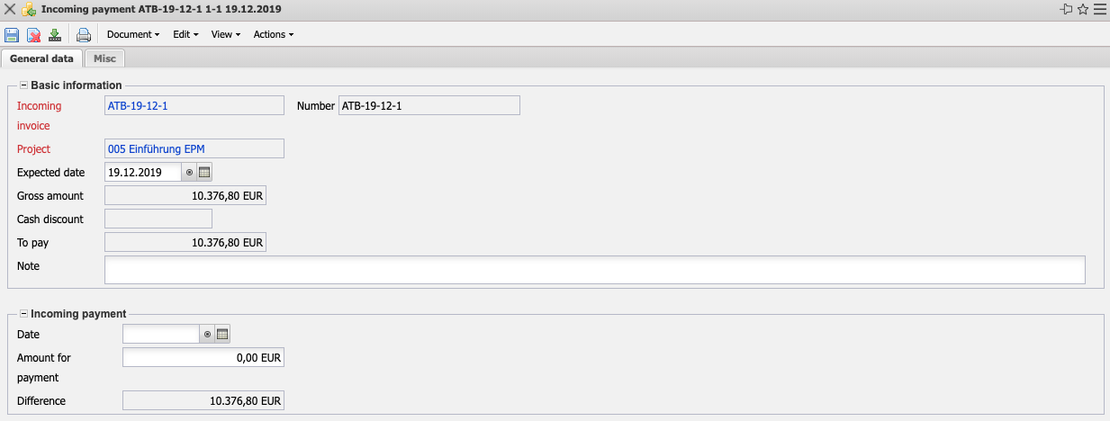 • Invoice/Number: This field identifies the number of the invoice. An invoiced invoice is copied to the incoming payment with the invoice number, its description, and the invoice amount as a data record.