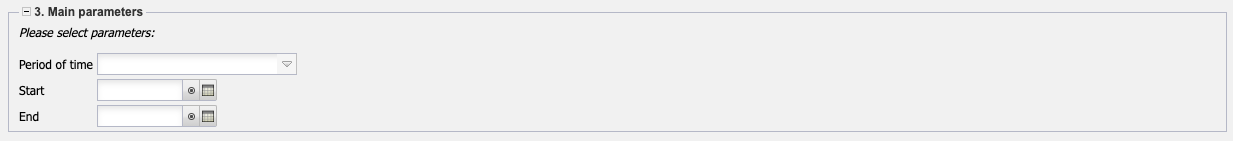 • Evaluation Period: This selection box refers to the evaluation period (Start and End elements) and allows a parameterized definition of the period for the time services. This selection (Current week, Current month, …, Next week, Last week, …) can also be used to simplify the manual definition of start and end.