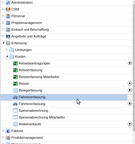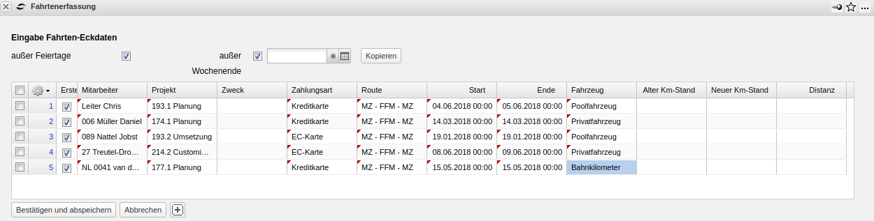 Anmerkung: Die Variante “Fahrtenerfassung Mitarbeiter” ist mit der beschriebenen Funktion identisch, kann aber nur für den angemeldeten Benutzer ausgeführt werden. Diese Variante wird verwendet, wenn die Mitarbeiter selber ihre Fahrtkosten erfassen sollen.