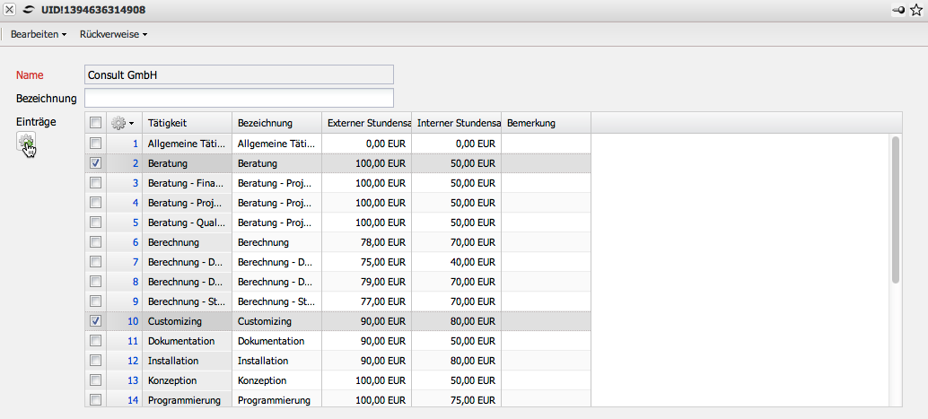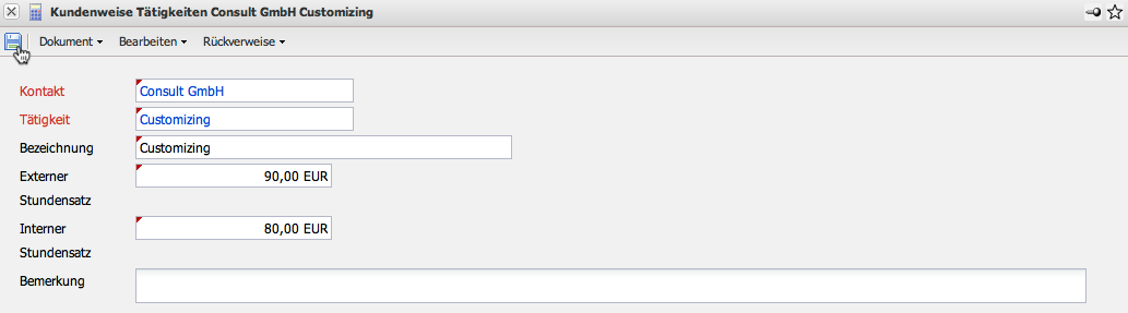 In diesem Beispiel bezieht sich dies auf die Tätigkeit Customizing für den Kunden CONSULT GmbH. Für jedes Projekt für diesen Kunden wird nun (wenn dem Arbeitspaket die Tätigkeit Customizing zugeordnet ist) der Satz von EUR 80,00 pro Stunde angeboten und berechnet.