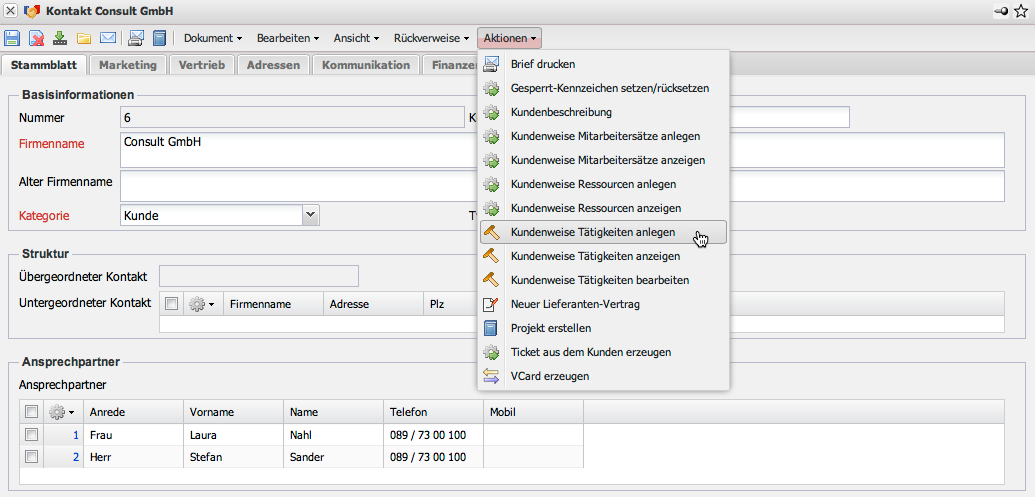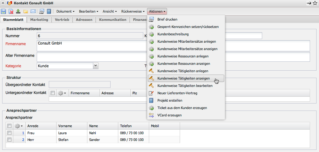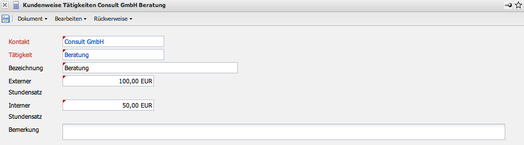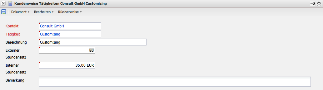 Die Kundenweisen Tätigkeiten ermöglichen die Definition von kundenbezogenen Berechnungssätzen auf Basis der Tätigkeiten. Die Verrechnungssätze der kundenbezogenen Tätigkeiten werden direkt aus dem Kontakt (Kunden) heraus definiert.