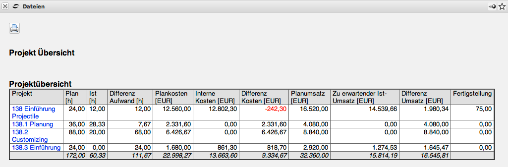 Diese Auswertung generiert eine Übersicht über die wichtigsten Eckdaten zum Projekt. Hier werden für die Projekte und Unterprojekte die Plan- und Istaufwände und angefallenen Kosten/Umsätze als Plan- und Istwerte angezeigt. Darüber hinaus werden in dieser Auswertung auch Angebots- und Rechnungswerte sowie die Fertigstellungsgrade der Projekte und Unterprojekte aufgelistet. Die Plankosten kennzeichnen die internen Kosten basierend auf den Plandaten der Arbeitspakete und aus der Budgetverwaltung. Die Internen Kosten werden aus der Leistungserfassung (TimeTracker) und der Kostenerfassung bestimmt. Das Projektbudget wird wird ggf. im Projekt definiert und die Plan-Erlöse ergeben sich aus der externen Bewertung der Arbeitspakete und der Budgetverwaltung. Die externen Erlöse kennzeichnen alle fakturierbaren Leistungen im System (Zeiten und Kosten).