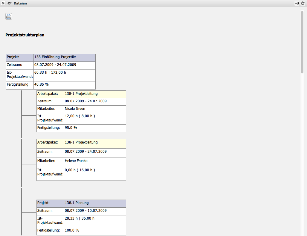 Die Auswertung Projektstrukturplan veranschaulicht die Projektstruktur. Der Projektstrukturplan in Projectile stellt die Beziehung des Projektes und der Unterprojekte mit den dazugehörigen Arbeitspaketen dar. Der logische Aufbau des Projektes (Projektstruktur/Projekthierarchie) wird bis auf Arbeitspaketebene in dieser Auswertung graphisch visualisiert. Diese Auswertung beinhaltet auch wichtige Plan- und Istdaten der Projekte, Unterprojekte und Arbeitspakete.
