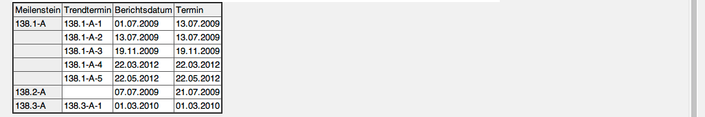 Die Auswertung Meilenstein-Trend-Analyse zeigt die Trends für die Erreichung der definierten Meilensteine an. Die Meilenstein-Trend-Analyse ist ein zukunftsbezogenes Instrument für die Terminkontrolle eines Projektes: An regelmäßigen Berichtszeitpunkten wird die Terminplanung des Projektes durch die Abfrage von Trenddaten der voraussichtlichen Zielerreichung neu geschätzt. Aus dem Kurvenverlauf läßt sich ein Trend über die Termintreue des Projektes ableiten. Die Trendtermine für die Meilensteine können im Dokumenttyp Trendtermin verwaltet werden.