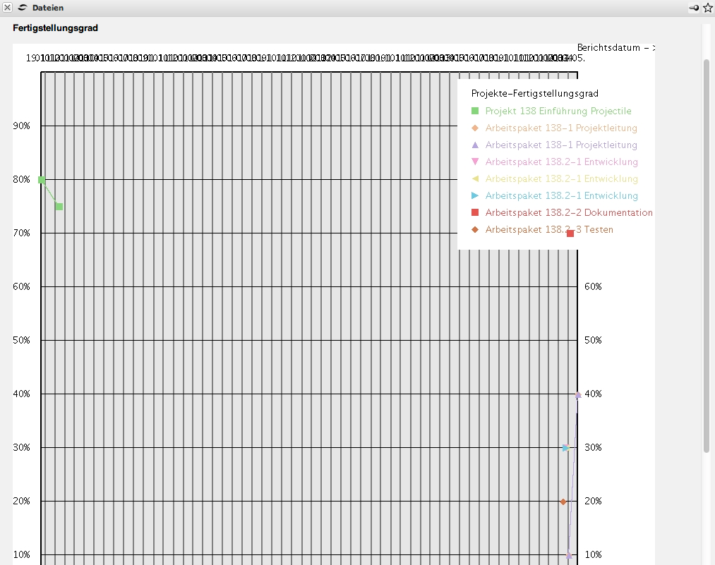 Die Auswertung Fertigstellungsgrad zeigt eine graphische Übersicht über die bisherigen Schätzungen für die Projekte und Arbeitspakete an. Diese Schätzungen können in den Projekten bzw. Unterprojekten oder im TimeTracker für die einzelnen Arbeitspakete vorgenommen werden. Weitere Informationen befinden sich im Abschnitt 4.2.7 Schätzungen.