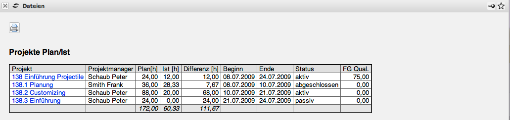Die Auswertung Projekte Plan/Ist liefert eine Übersicht über die Arbeitsleistungen der einzelnen Projekte inklusive der dazugehörigen Unterprojekte. Die Plan- und Ist-Zeiten für die Projekte werden als Diagramm und in Form einer Liste dargestellt. Dabei werden die Plandaten direkt über die Zuordnung der Arbeitspakete zum Projekt oder Unterprojekt bestimmt und die Ist-Zeiten werden aus den Erfassungsdaten des TimeTrackers gewonnen. Die Auswertung beinhaltet darüber hinaus auch noch Informationen über Plan-Start und -Ende, über den Projektstatus und den geschätzten Fertigstellungsgrad.