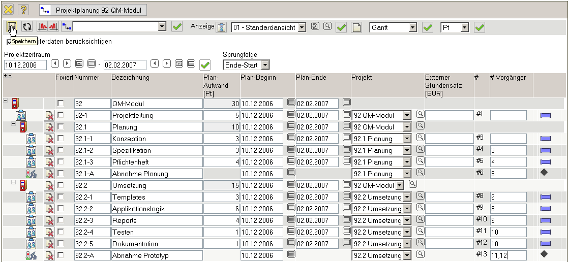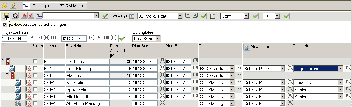 Nach der Zuordnung der Mitarbeiter wird der Projektplan gespeichert.