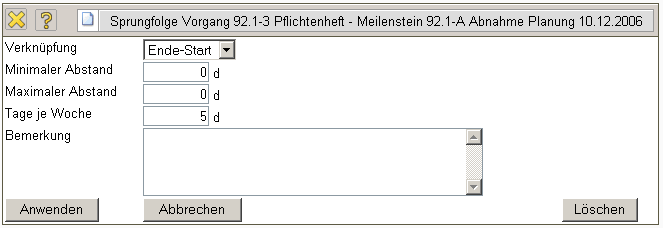 Maximaler Abstand: Zeitbeeinflussung in Tagen für das nachfolgende Arbeitspaket. Werden bei den Abständen keine Einträge vorgenommen, geht das System von der Zeitspanne aus, um die ein Vorgang ausgehend von seinem frühestmöglichen Anfangszeitpunkt verschoben werden kann, ohne den frühestmöglichen Anfang seiner Nachfolger zu beeinflussen.