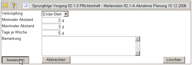 Anmerkungen: Im Modus “Vorgänger” oder Nachfolger werden mehrere Elemente durch das Komma getrennt. Ablaufbeziehungen können nicht auf Teilprojekte oder zwischen Projektstrukturen gesetzt werden.