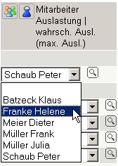 … listet dann in der Auswahlbox nur die Mitarbeiter auf, welche die Tätigkeit des Arbeitspaketes auch in der Mitarbeiterverwaltung zugeordnet haben. Im Beispiel sind im System für die Tätigkeit Projektleitung nur die Mitarbeiter Batzeck, Meier und Müller geeignet (oder vorgesehen). Nur diese Mitarbeiter haben in der Mitarbeiterverwaltung die Tätigkeit Projektleitung zugeordnet. Der Mitarbeiter Schaub war vorbelegt und bleibt in dieser Auswahl.