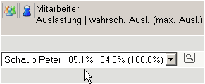 Erläuterung der Auswahlbox: Mitarbeiter: Auslastung über alle Projekte | Auslastung unter Berücksichtigung der Projektwahrscheinlichkeit geplanter Projekte (Maximale Kapazität des Mitarbeiters).