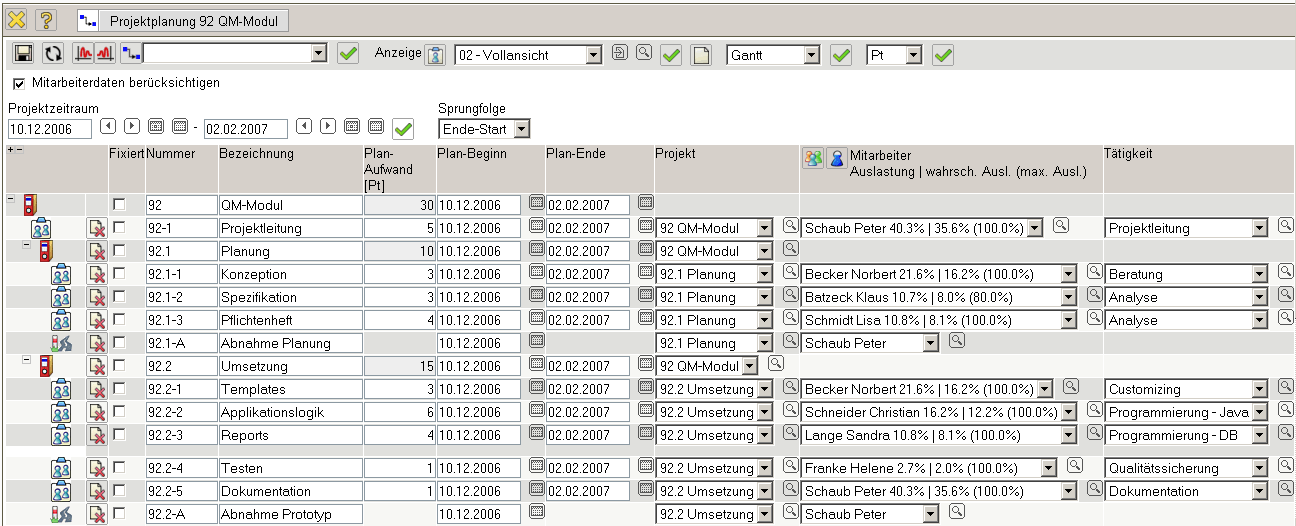 In der Ansicht “Vollansicht” können für jedes Arbeitspaket der Mitarbeiter und die Tätigkeit definiert werden. Anmerkung: Die dokumentierte Ansicht ist nur ein Anwendungsbeispiel und kann vom Benutzer angepasst werden.